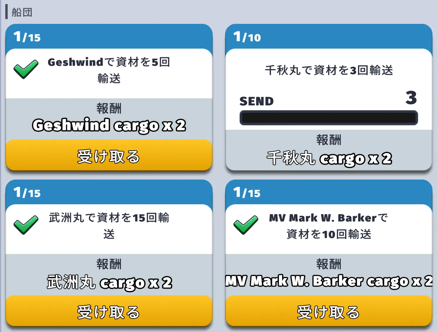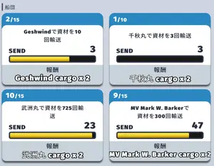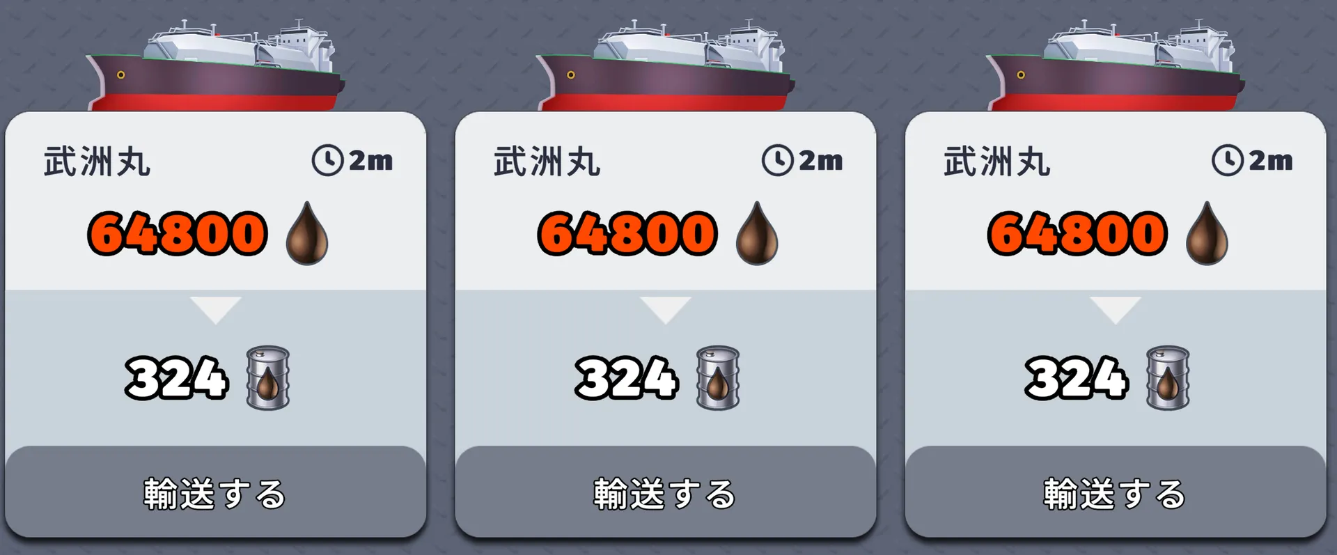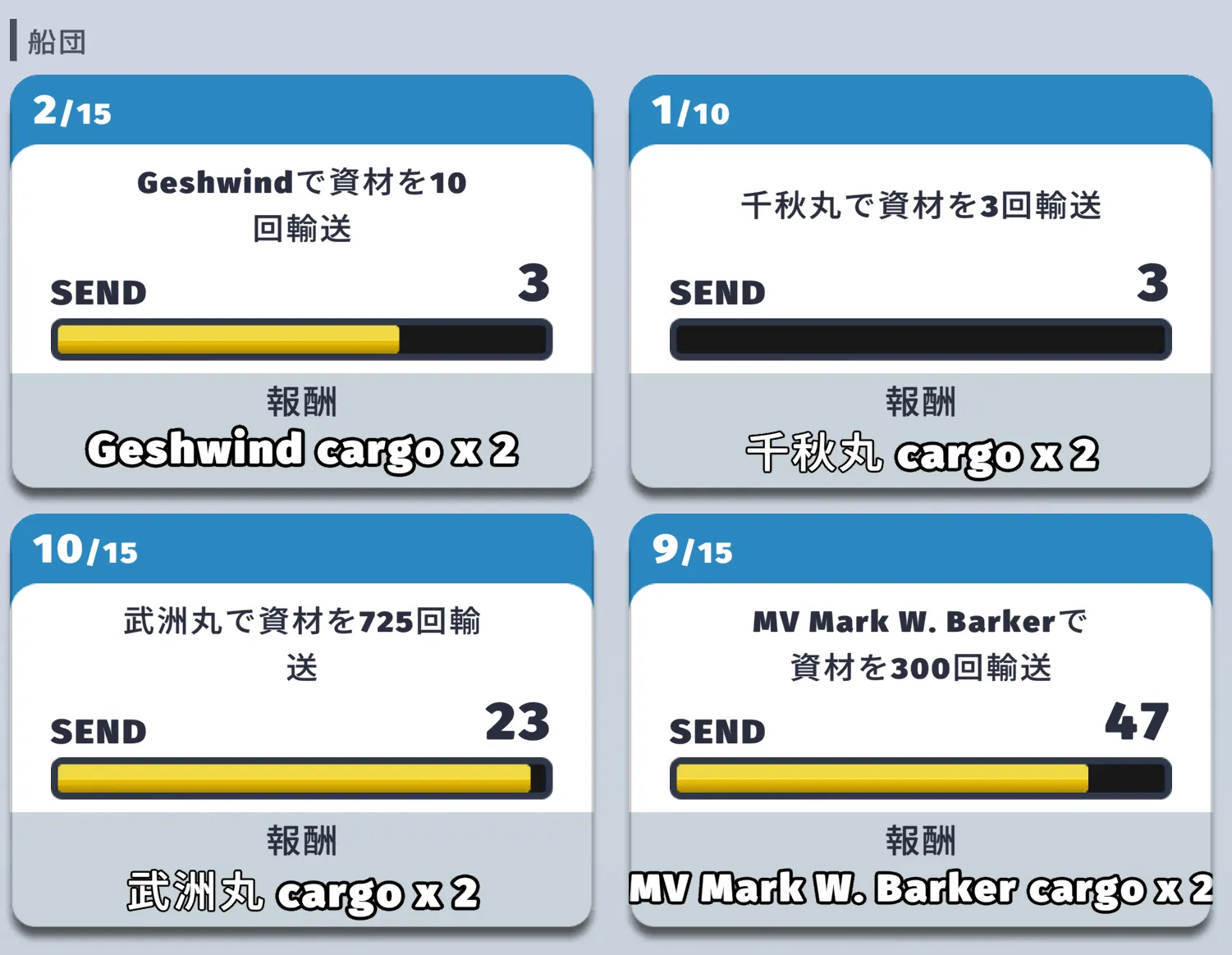 2時間遅れで開始。面倒なイベントだなと思っているのでモチベーションは低め。相変わらずデバッグをまともにしていないなって感じの文字化けで読めないメッセージにも萎える。とりあえずオイル輸送が重要そうなので、武州丸の数を増やすのと、積載量を増やすのが重要と認識。MV MARK W.BARKERまで使用可能にしました。積載量の制限に引っかかると予想されるため、GESHWINDは第2ラウンド以降かなあ。3位フィニッシュとなりました。
