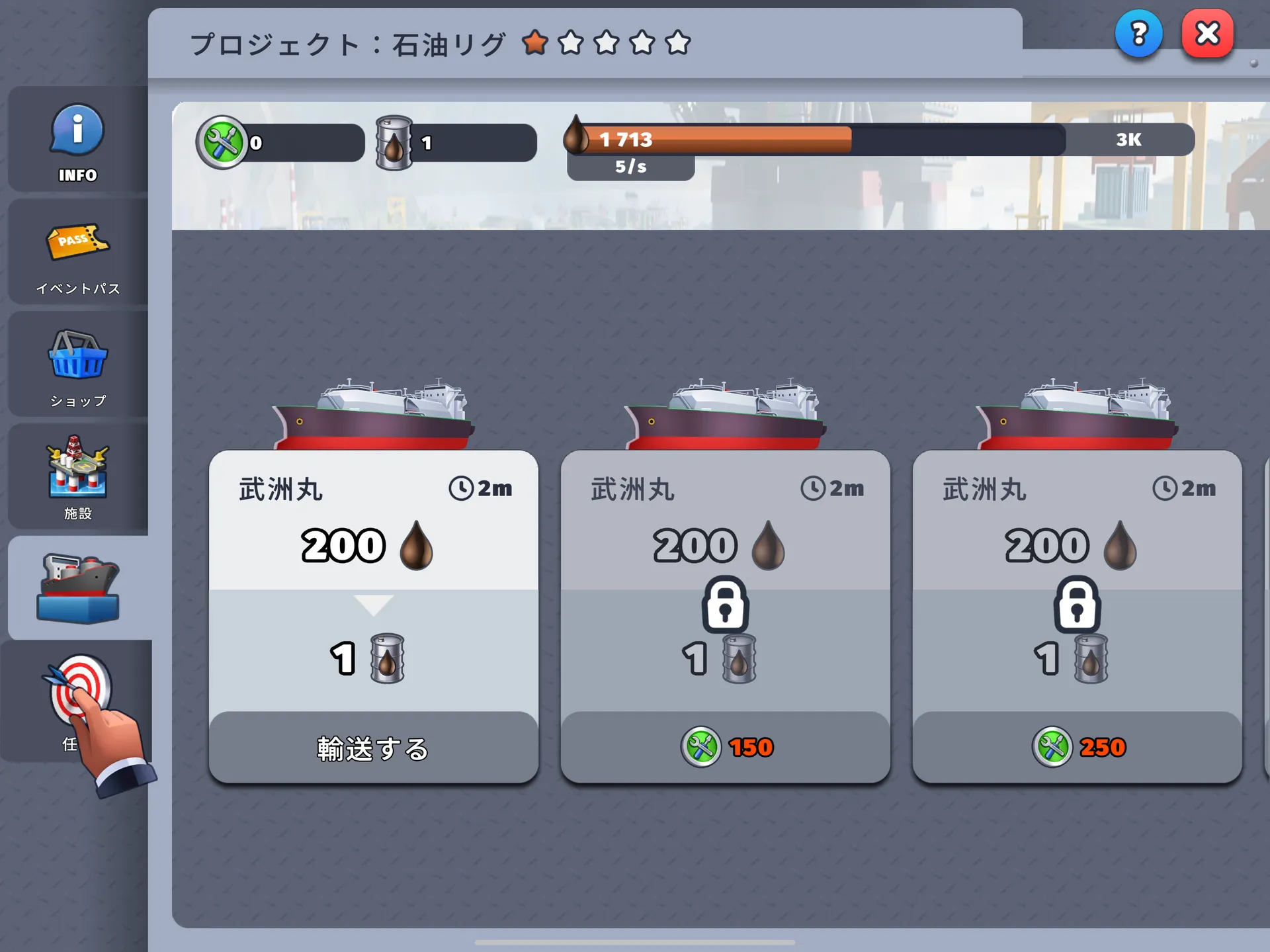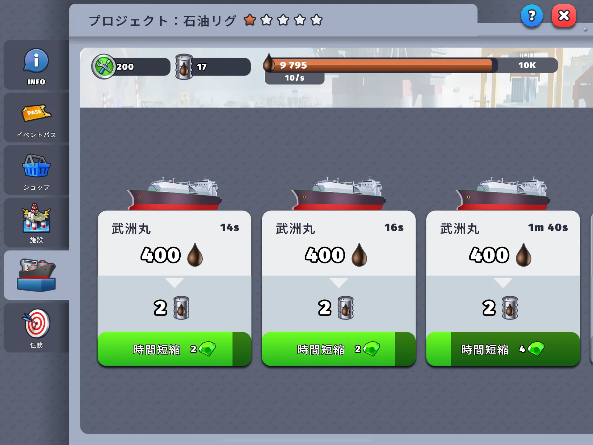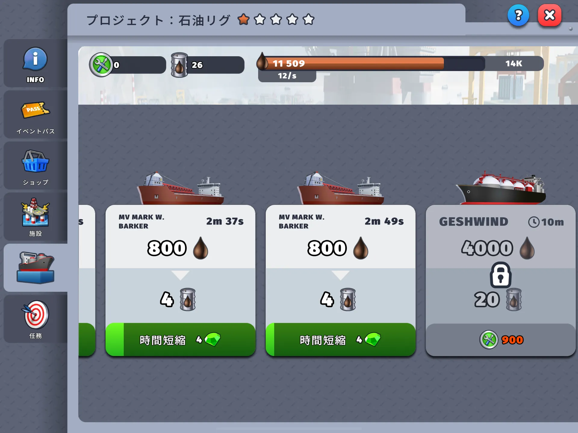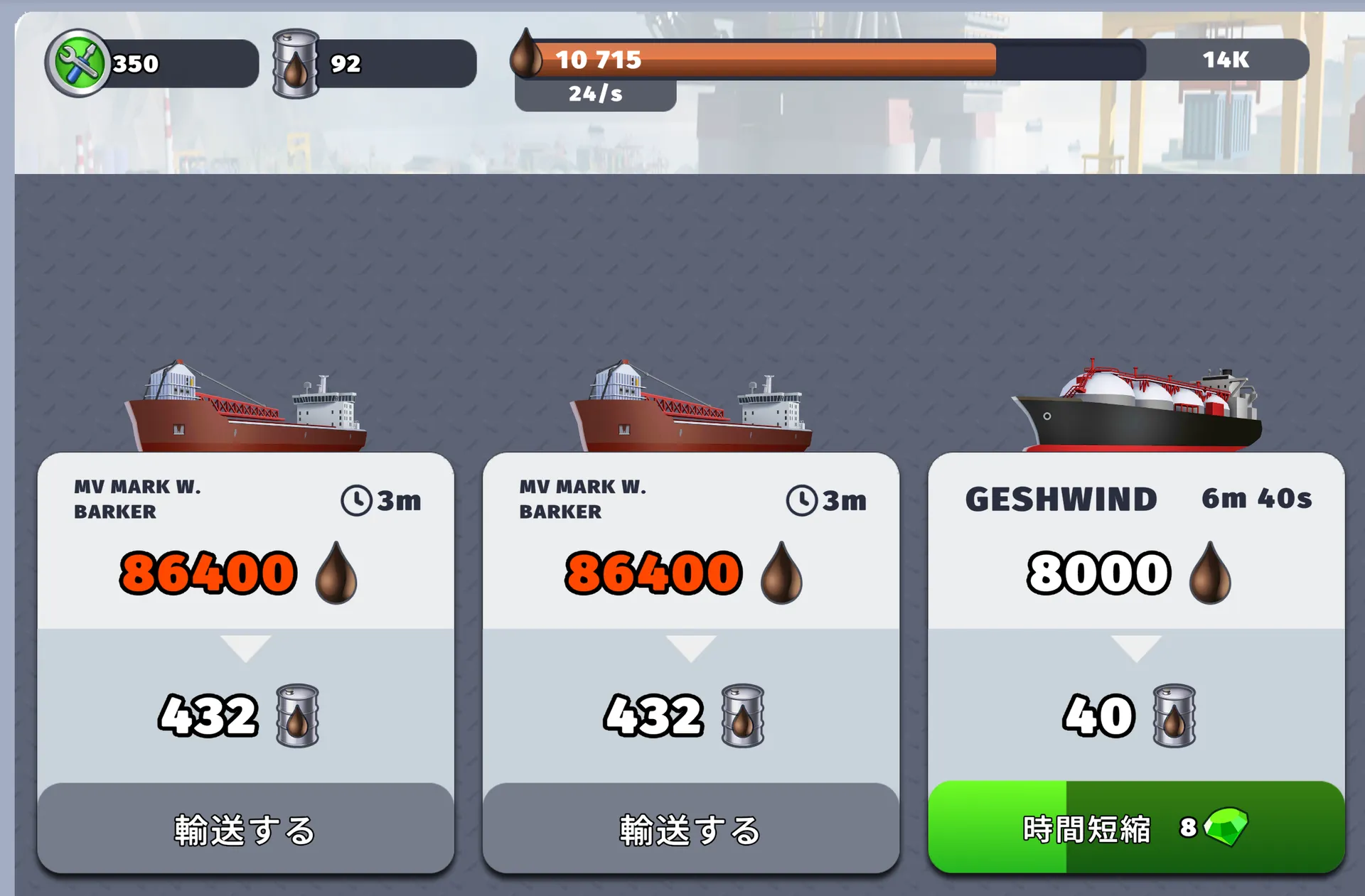 2時間遅れで開始。面倒なイベントだなと思っているのでモチベーションは低め。相変わらずデバッグをまともにしていないなって感じの文字化けで読めないメッセージにも萎える。とりあえずオイル輸送が重要そうなので、武州丸の数を増やすのと、積載量を増やすのが重要と認識。MV MARK W.BARKERまで使用可能にしました。積載量の制限に引っかかると予想されるため、GESHWINDは第2ラウンド以降かなあ。3位フィニッシュとなりました。