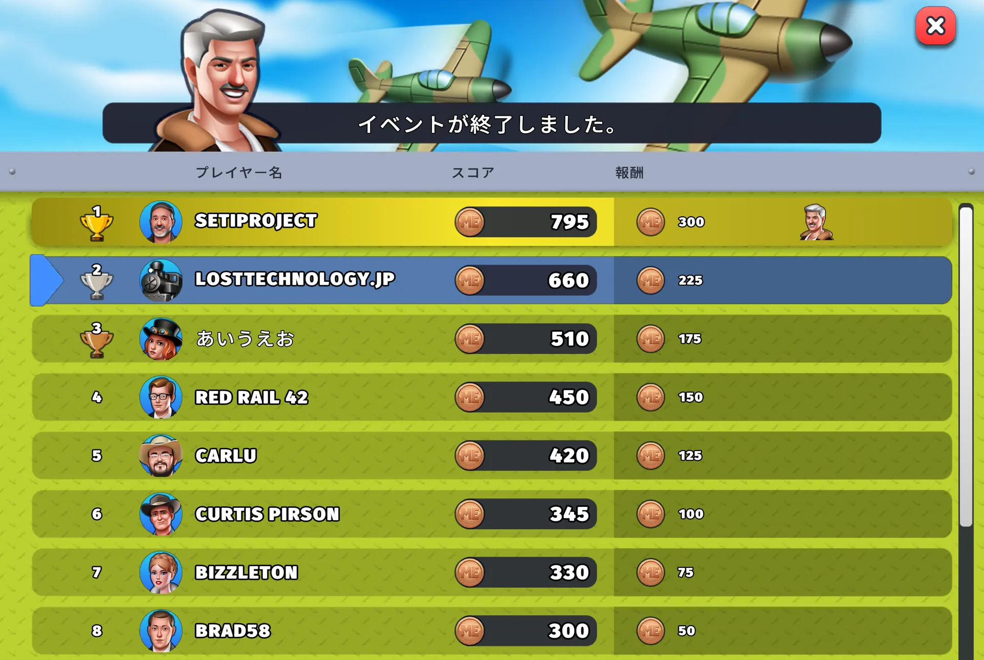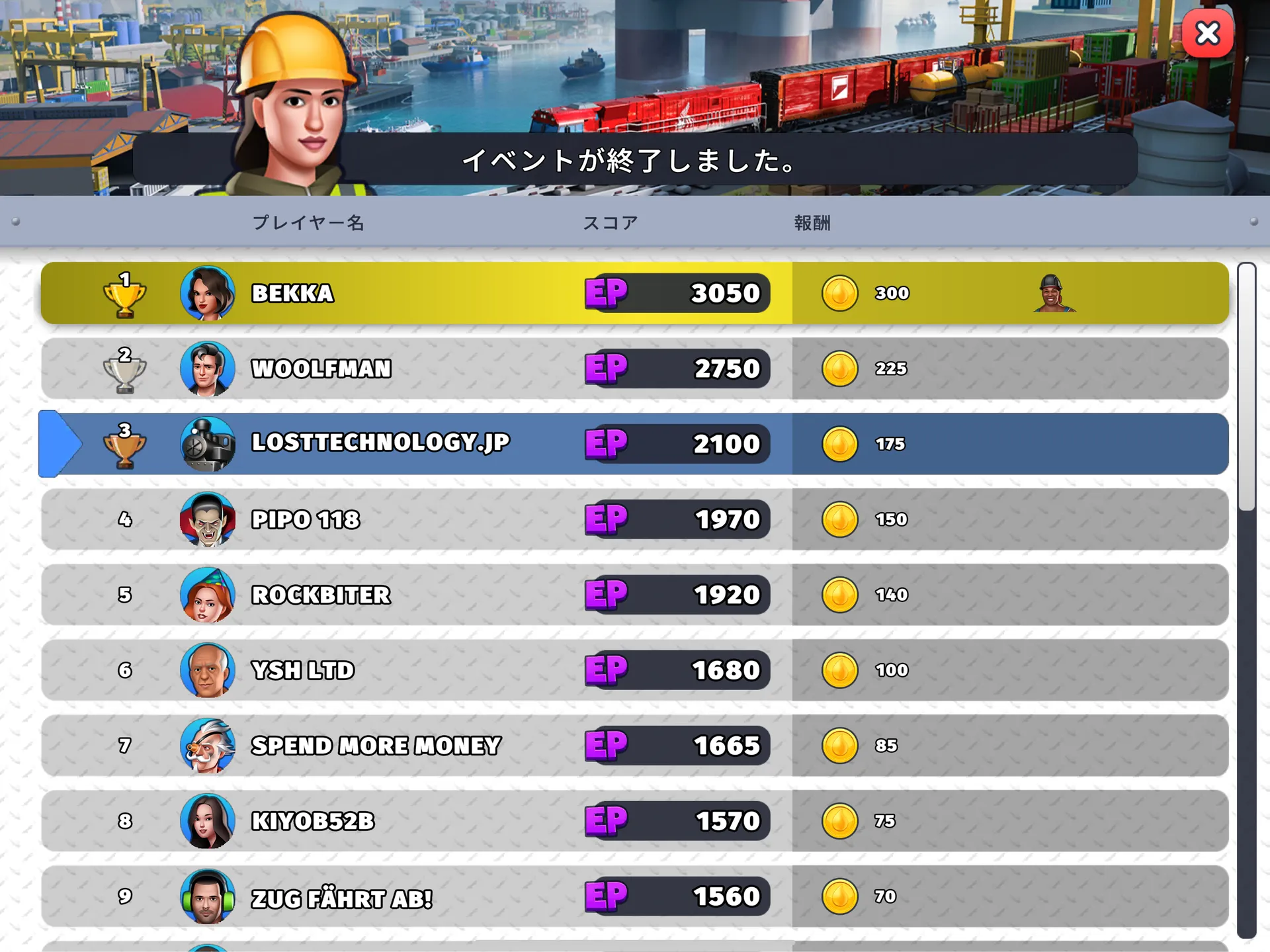 15分遅れで開始。このイベントは列車を待機させずにアルミニウム板の回収にまわすことがポイントとなりそう。イベント工場で使用する比率が高いので。そうすると倉庫上限までにどれだけ余裕があるかが重要になりそうなんですよね💦 なんとか2位フィニッシュです。