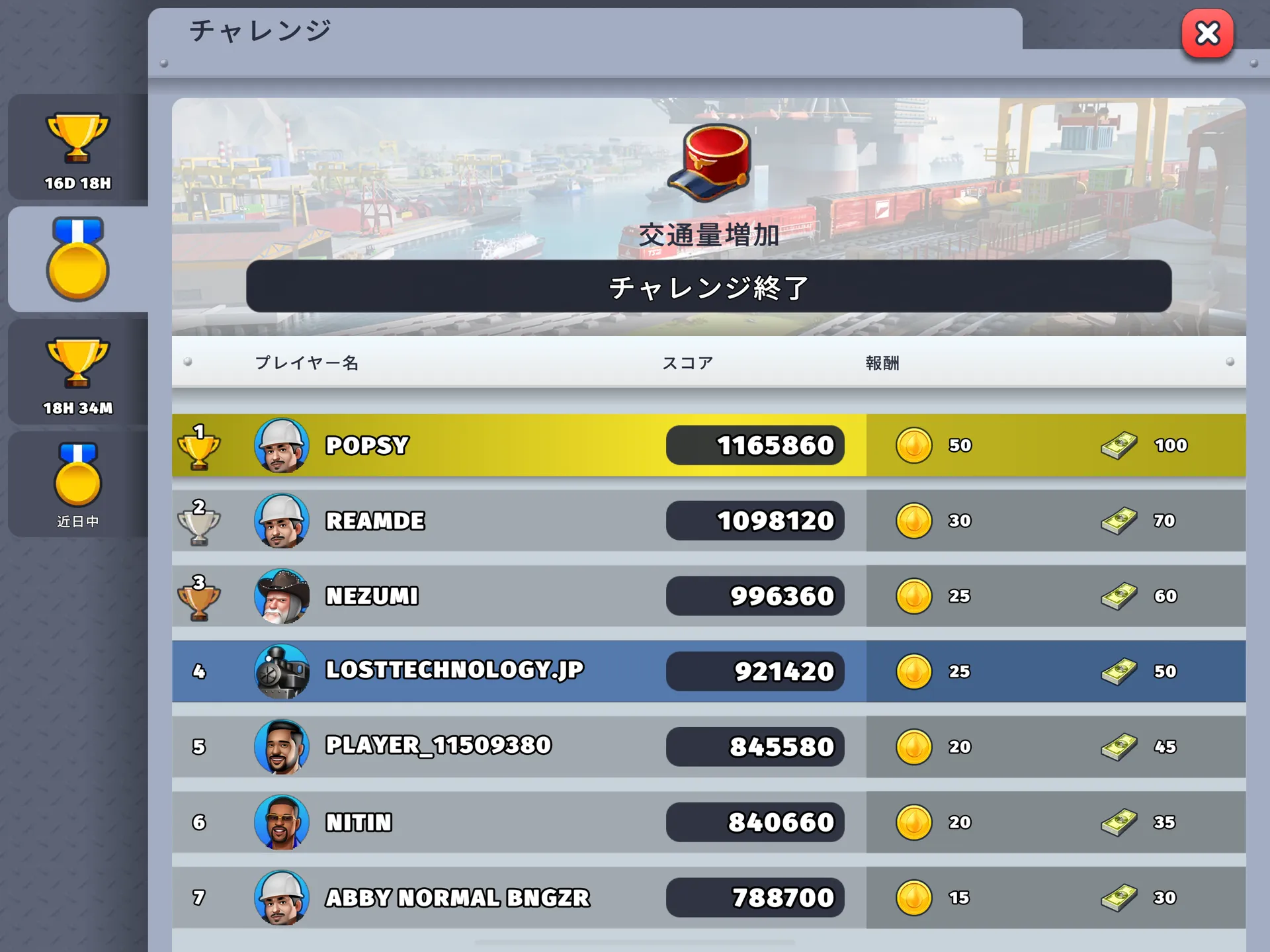 アップグレードをしたら絶望的な無理ゲーになったんですけれど。これどうすればいいんでしょうね。運営はこのゲームバランスに自信を持っているようなのですが……。引退者が増えそうです。交通量増加チャレンジでは同じユニオンのNEZUMIさんと同じグループでした。久しぶりに同じグループにユニオンの仲間を見かけて嬉しかった(笑)。