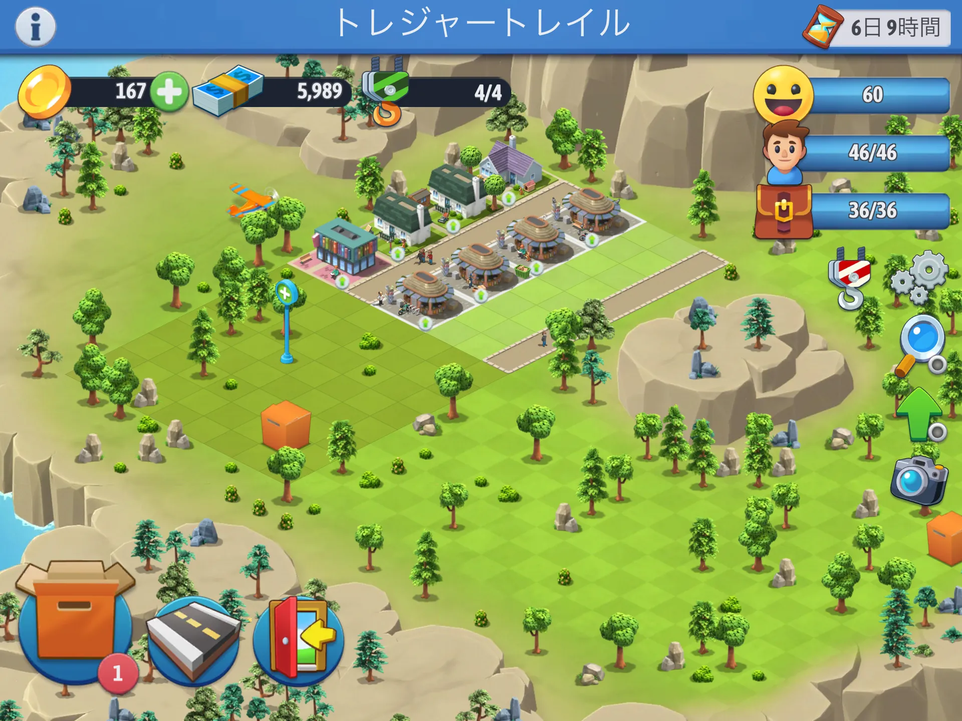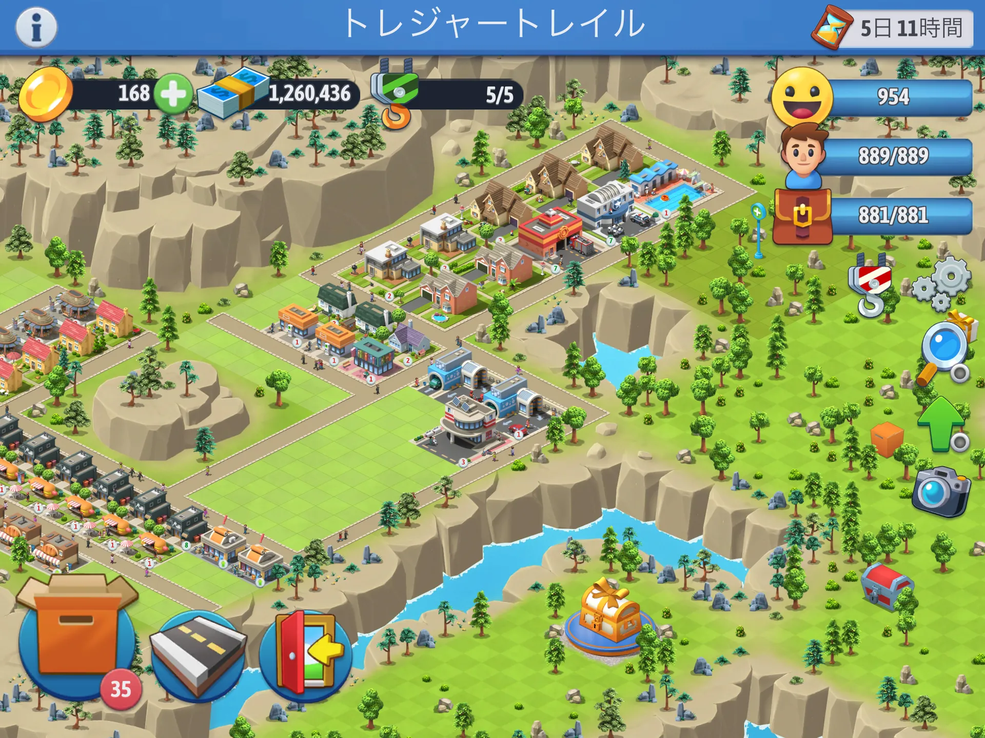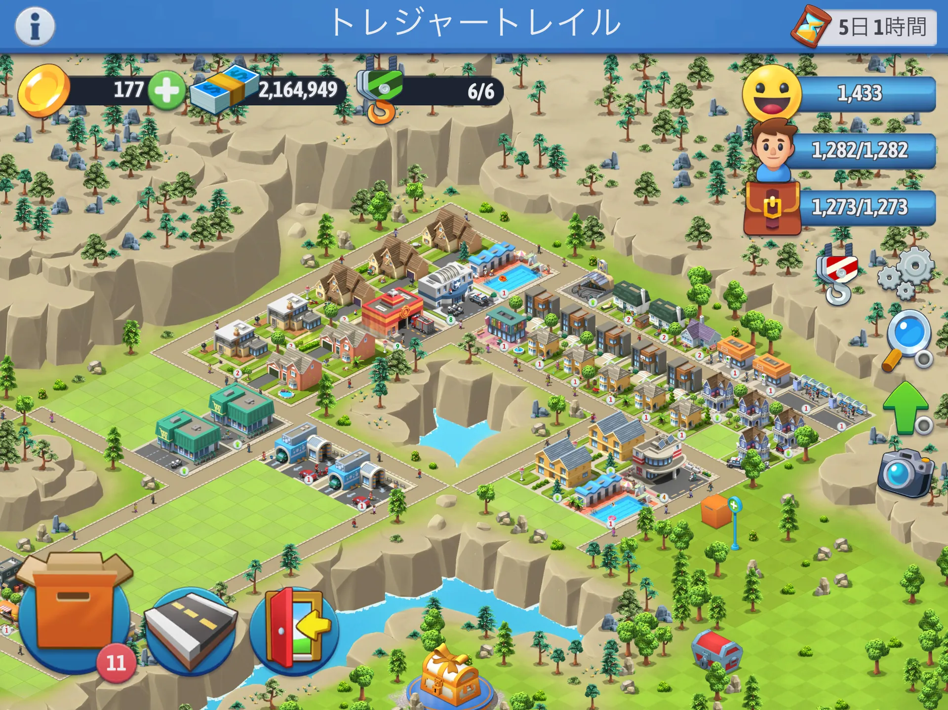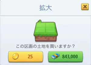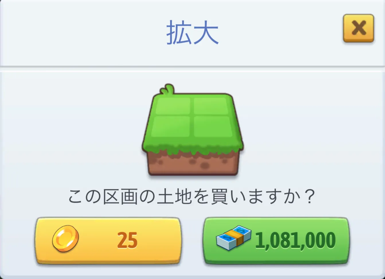 ピザレストラン2件と銀行2件を初期エリアのほうに建設。住人を増やすために拡張して進んでいる先端エリアへ家を建てていきます。家の建設時間が長いため、強制的に足止めされるという💦 完成を待たずに先に進んでもいいのですが、別に急ぐ必要もないので家が完成してからに。資金を1,621,000確保できたら次の区画を購入。
