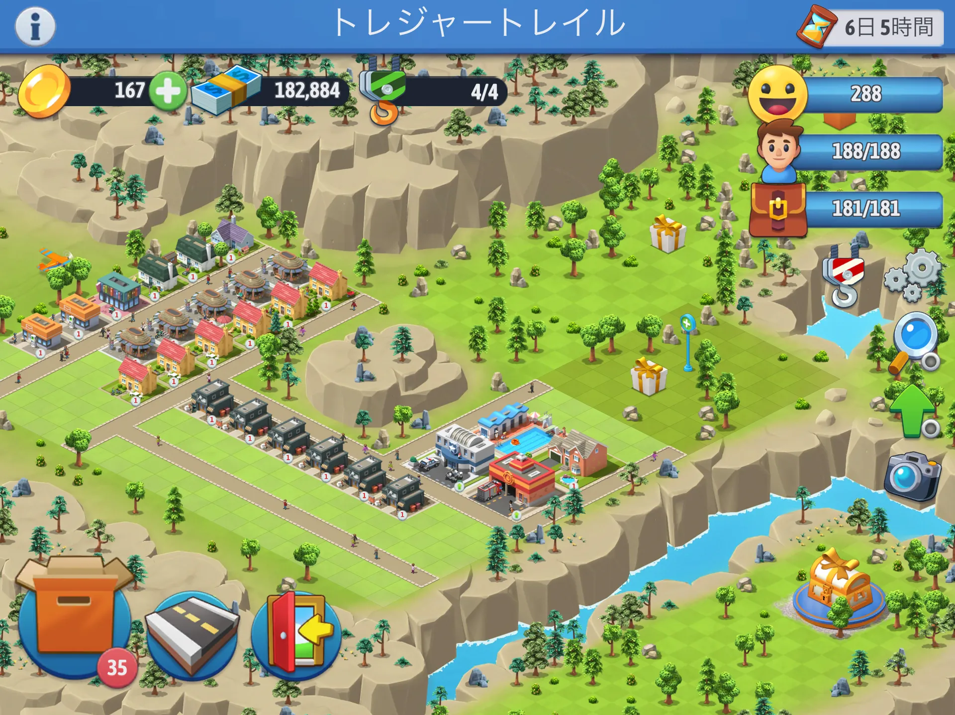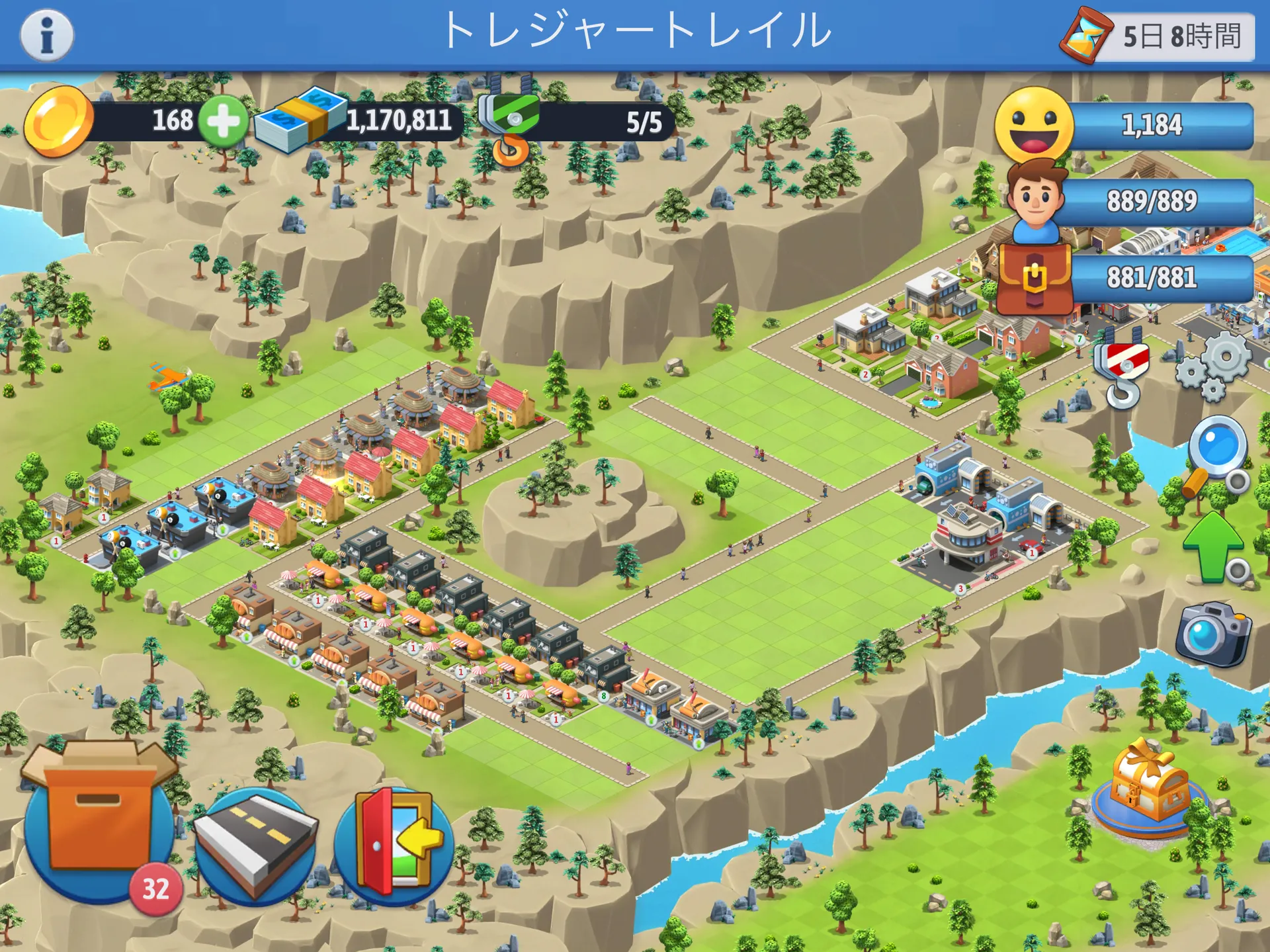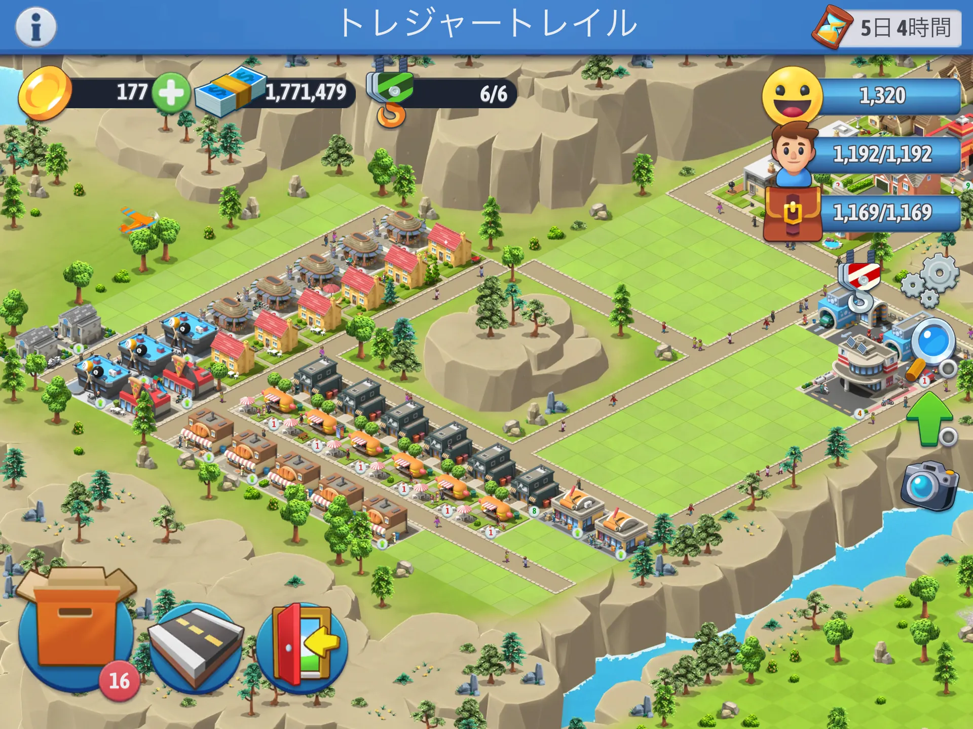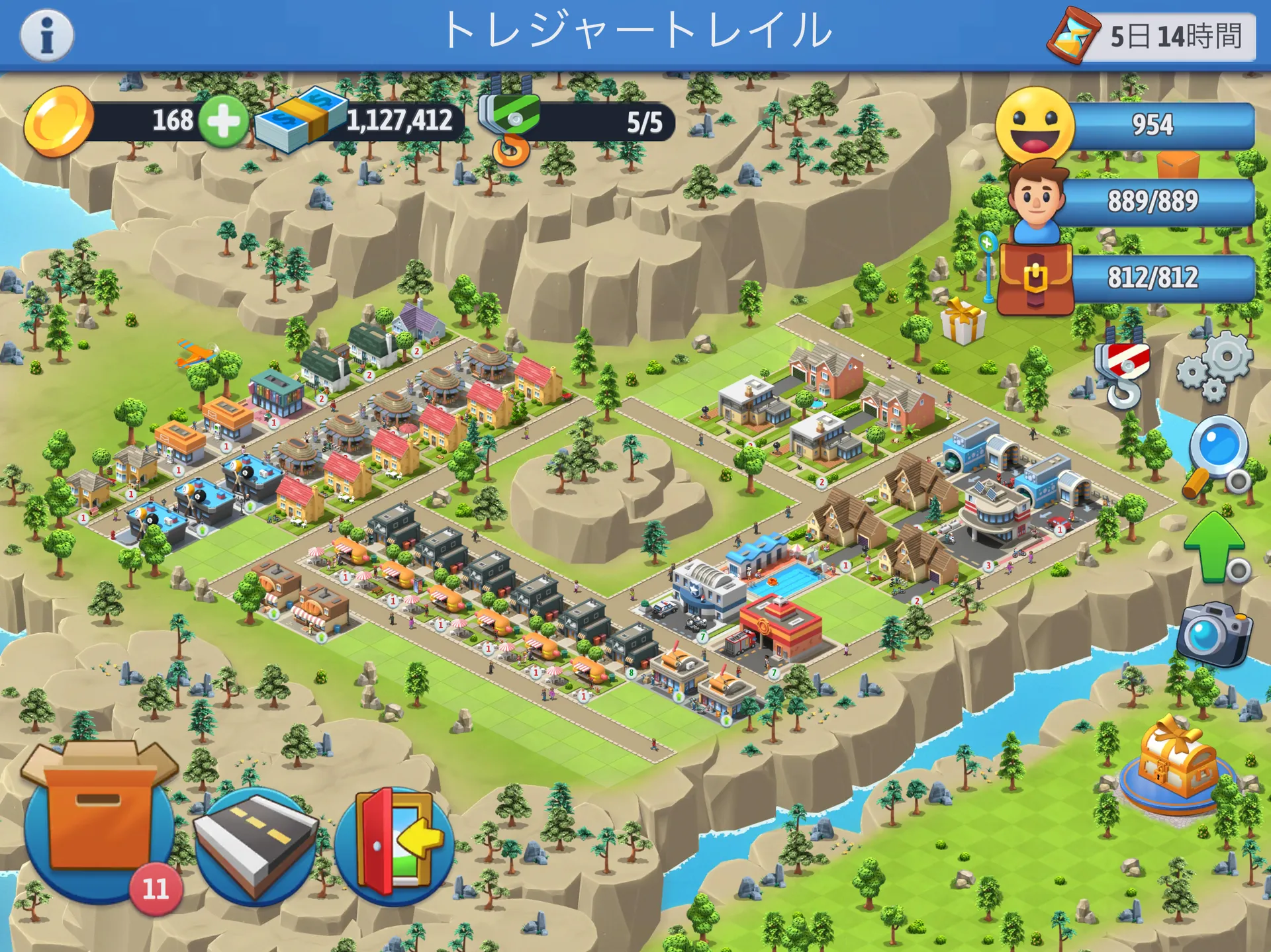 ピザレストラン2件と銀行2件を初期エリアのほうに建設。住人を増やすために拡張して進んでいる先端エリアへ家を建てていきます。家の建設時間が長いため、強制的に足止めされるという💦 完成を待たずに先に進んでもいいのですが、別に急ぐ必要もないので家が完成してからに。資金を1,621,000確保できたら次の区画を購入。