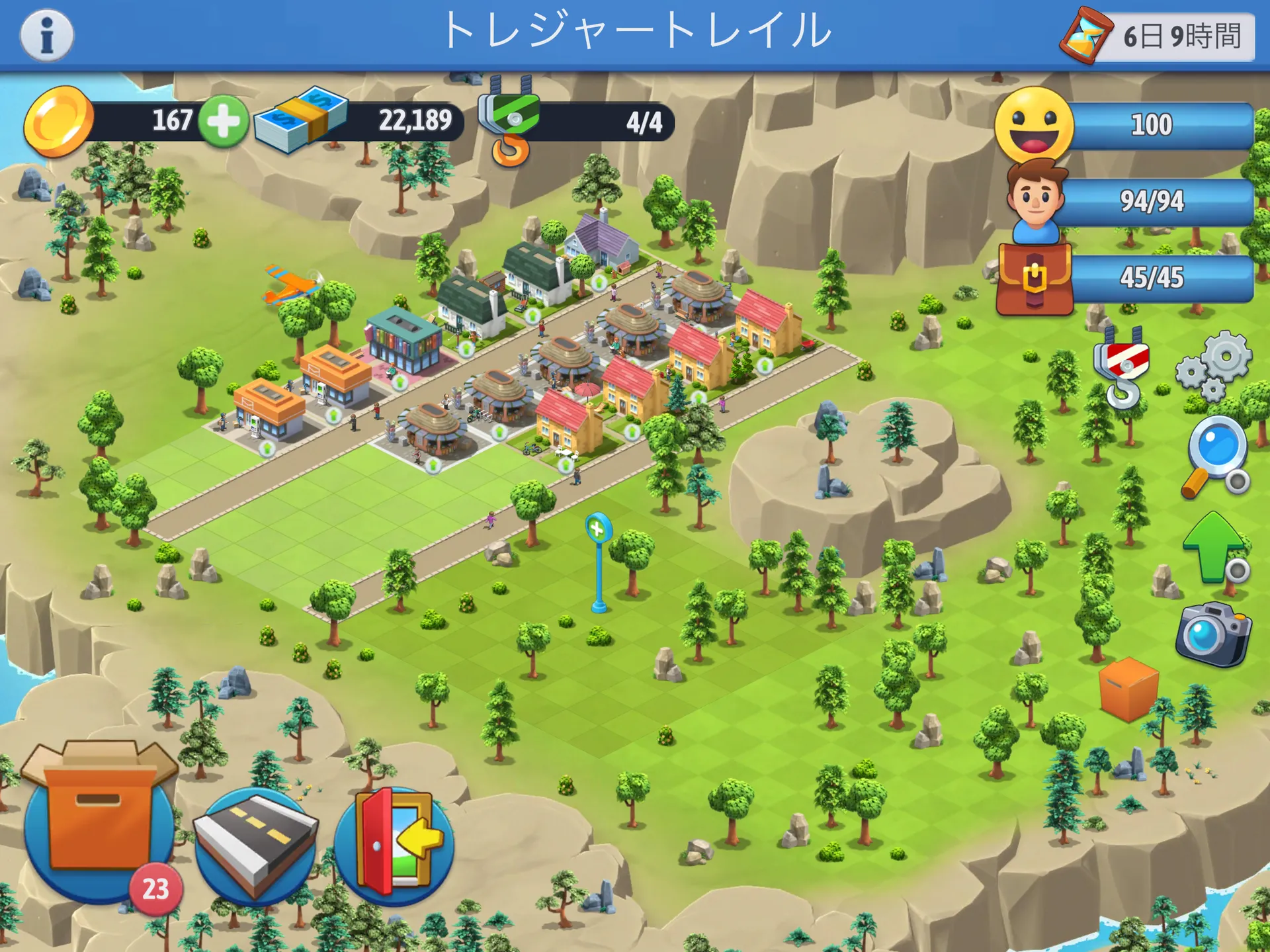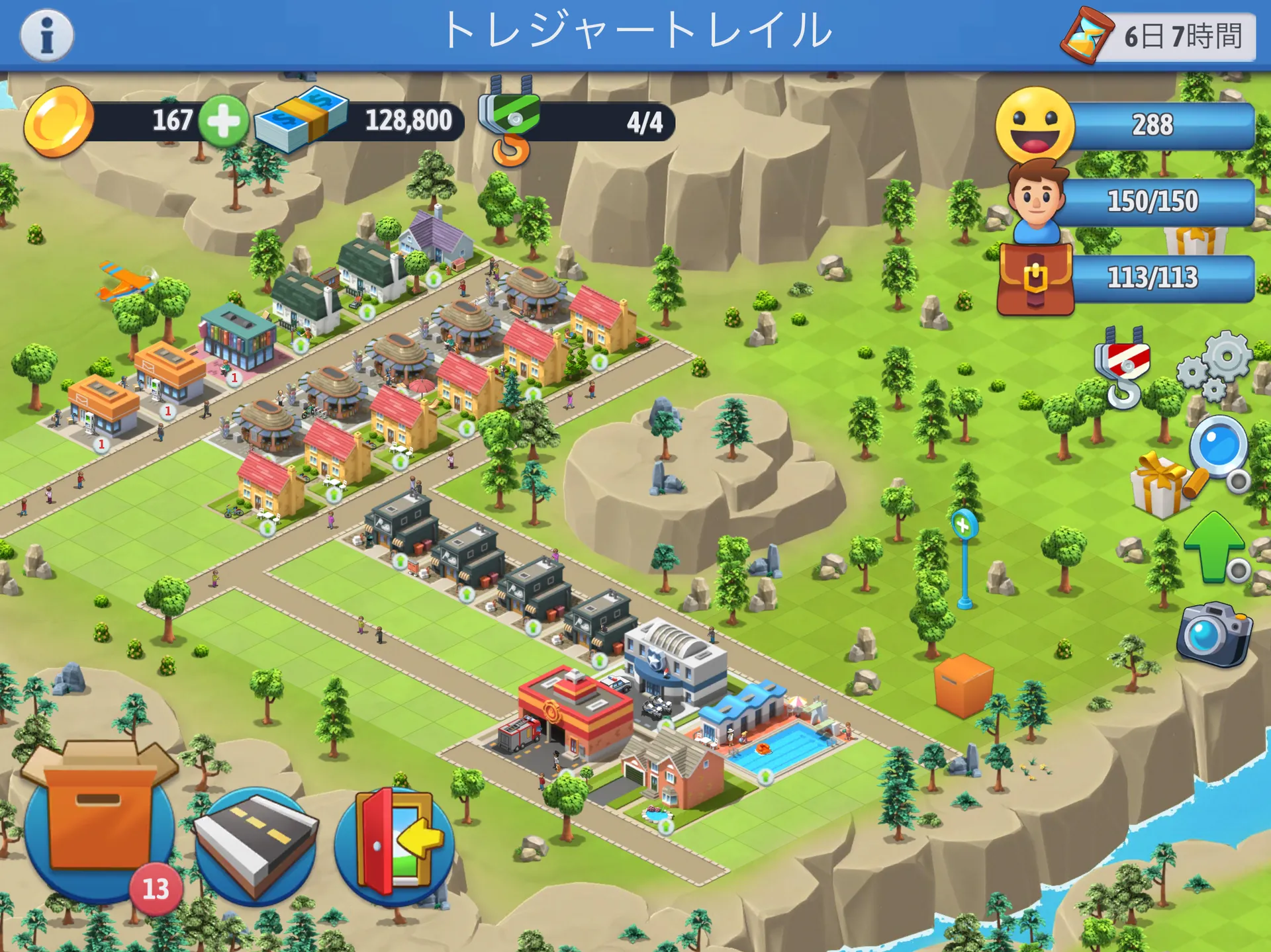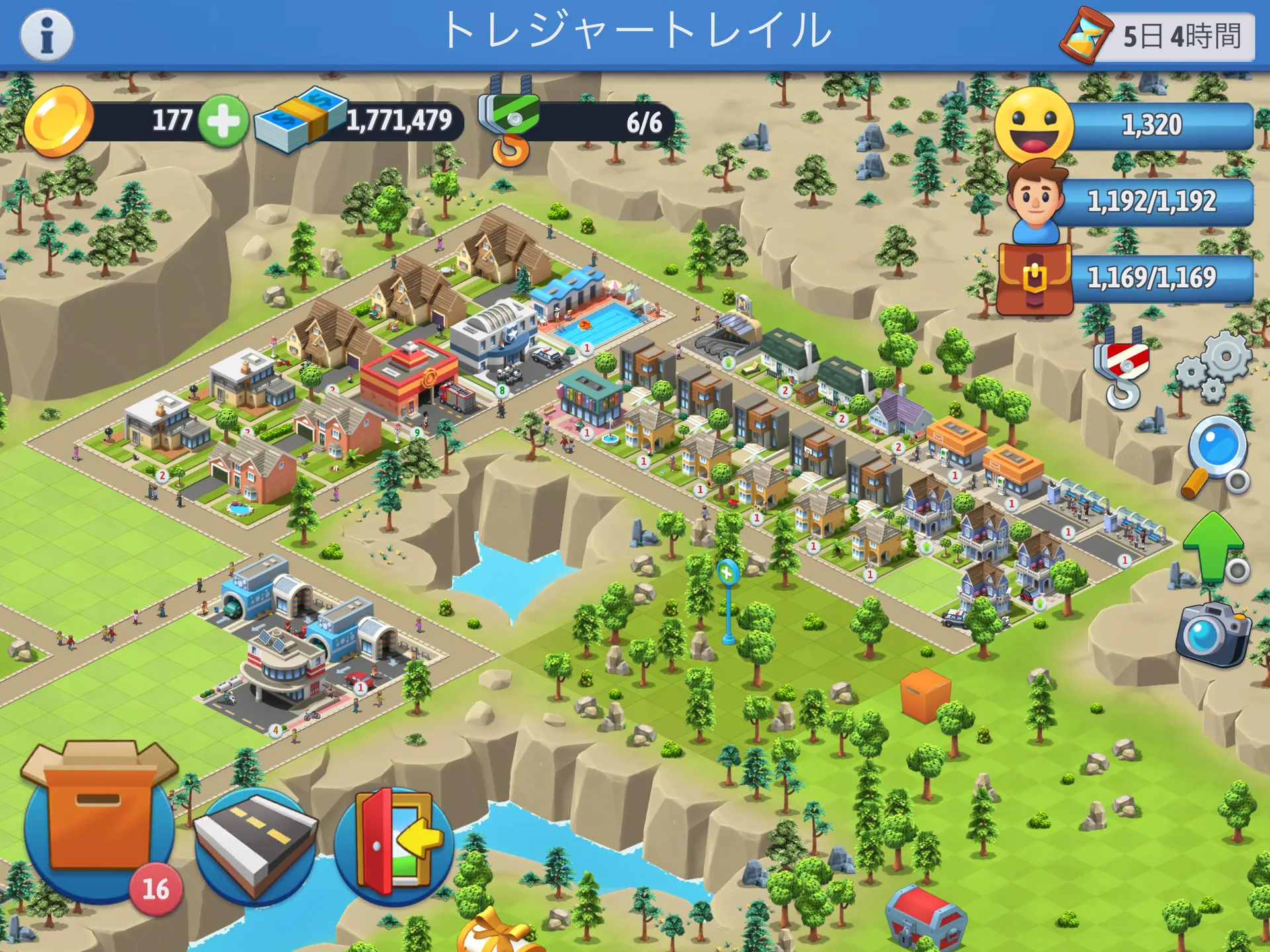 大きな家と病院の建設をします。増えた人口を活用して、ホットドッグ売店の出店を開始。そして建物はすべてレベル1まで上げておきます。洗車場も2件建設。洗車場は移転させない予定の場所への設置です。ただし、住人不足になるので、家のレベルを上げないとダメですね。資金を421,000確保できたら次の区画を購入。