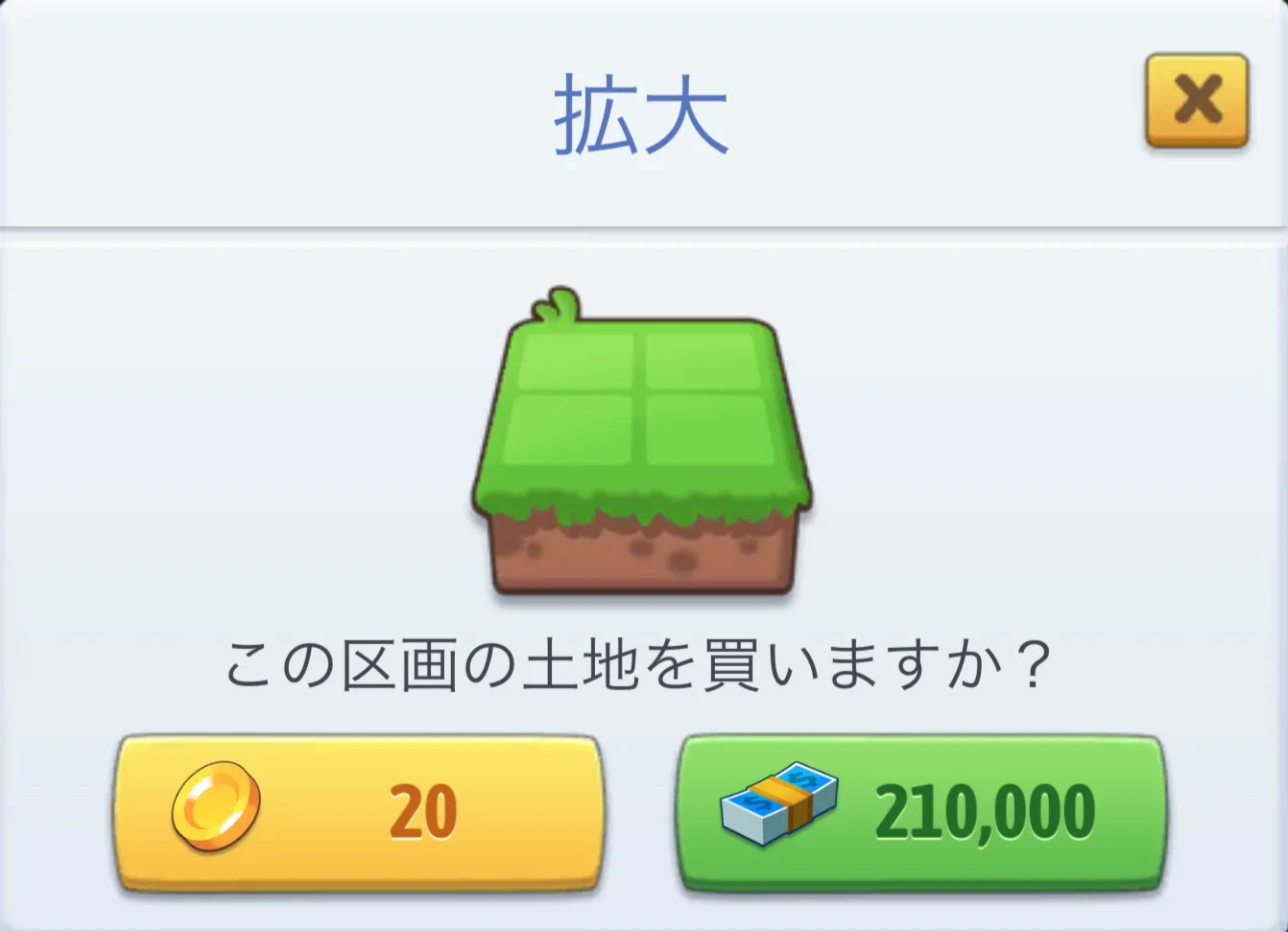 3×3の建物をこの区画に移転してきます。後でさらに移転するわけですが、使える土地が狭いので仕方がありません。肉屋を追加で2件建設し、区画1と2の建物はすべてレベル1まで上げます。区画5に移転させた大きな家もレベル1に。その後、肉屋もレベル1に上げて、資金を210,000確保できたら次の区画を購入してクレーンを確保します。