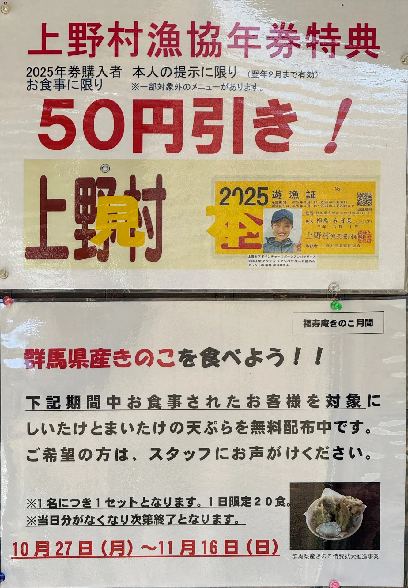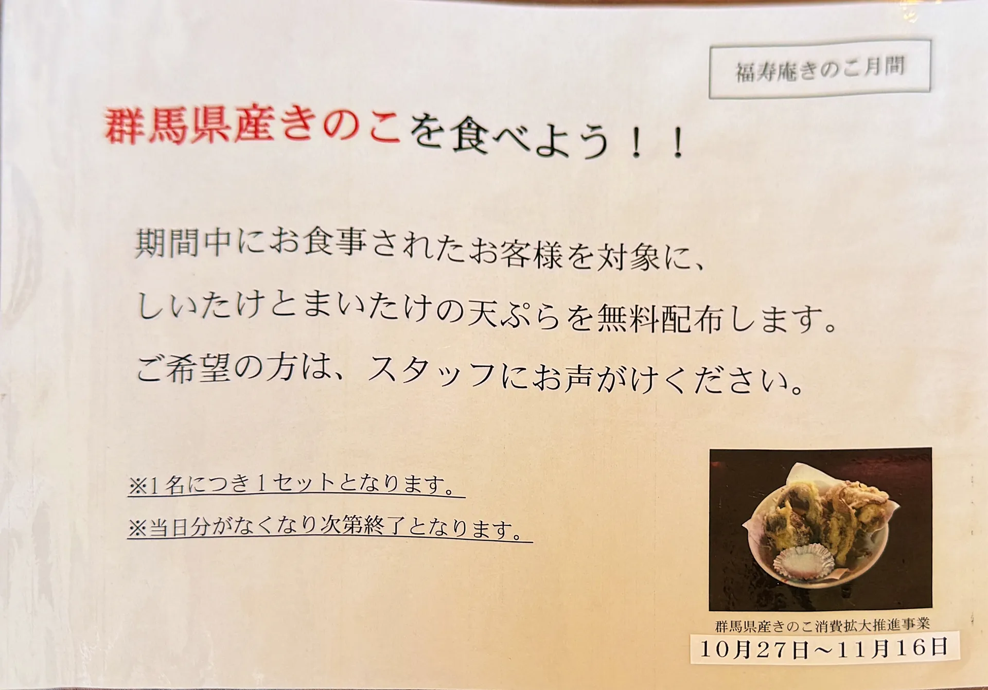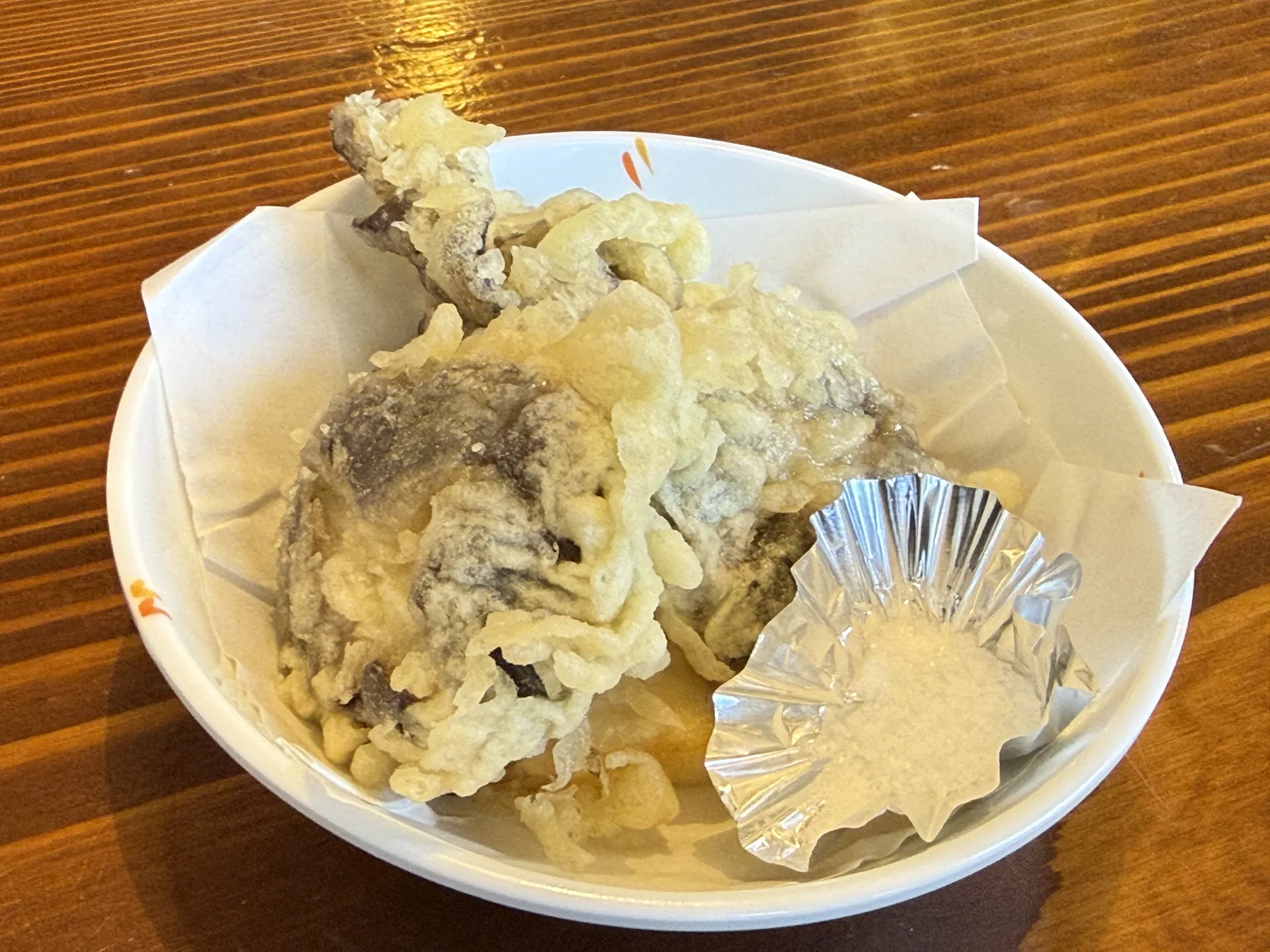 開店25分前ぐらいに福寿庵の前に移動しました。天ぷらセットの無料提供の先着20名の枠は、開店時間には15人いたのでほぼ開店と同時じゃないと難しいですね。開店から10分ほどで先着20名の枠は終わってしまっていました。自分は「山かけそば(温)」900円を注文。無料でいただけた天ぷらセットはかなり美味しかったです。