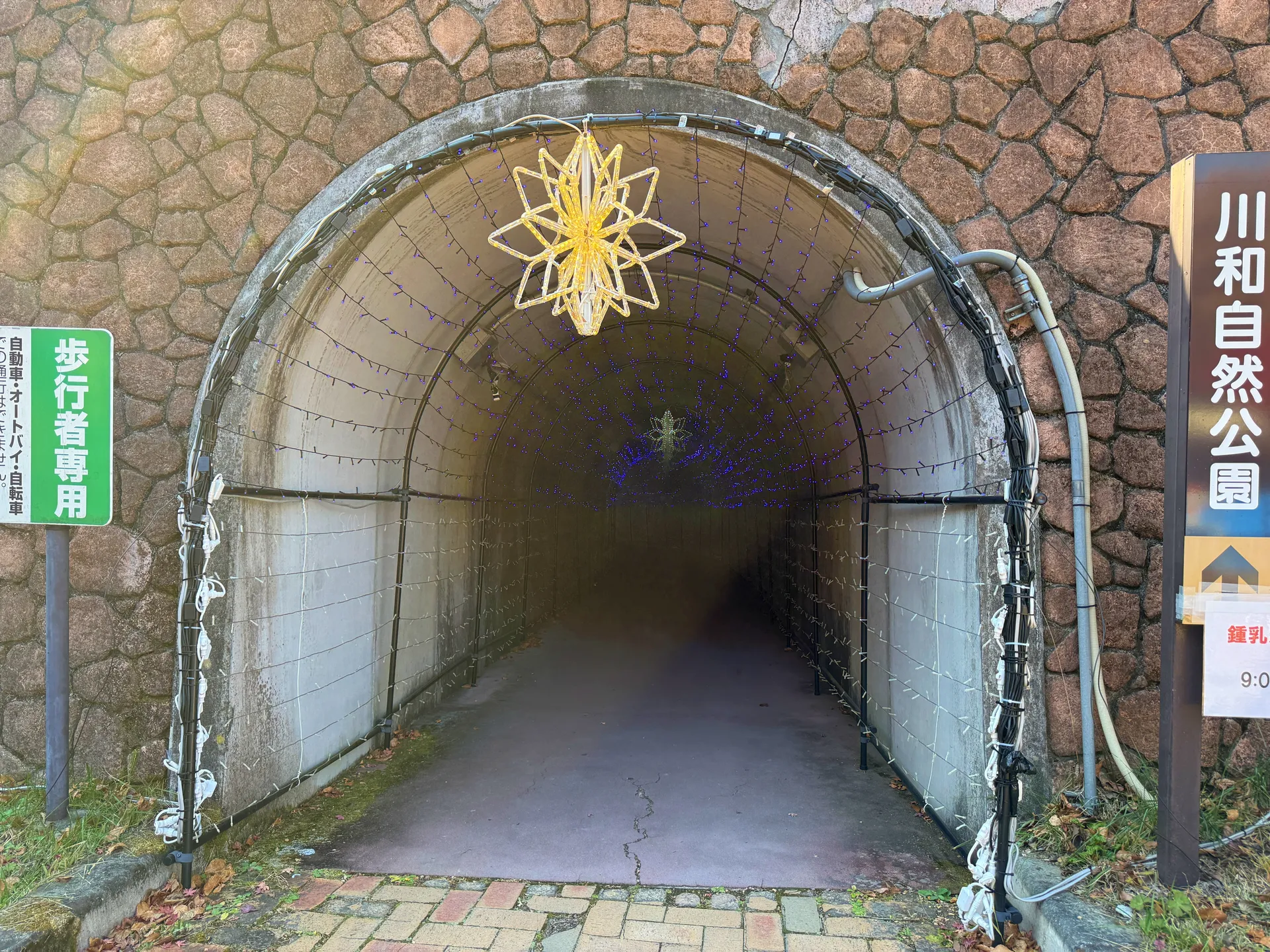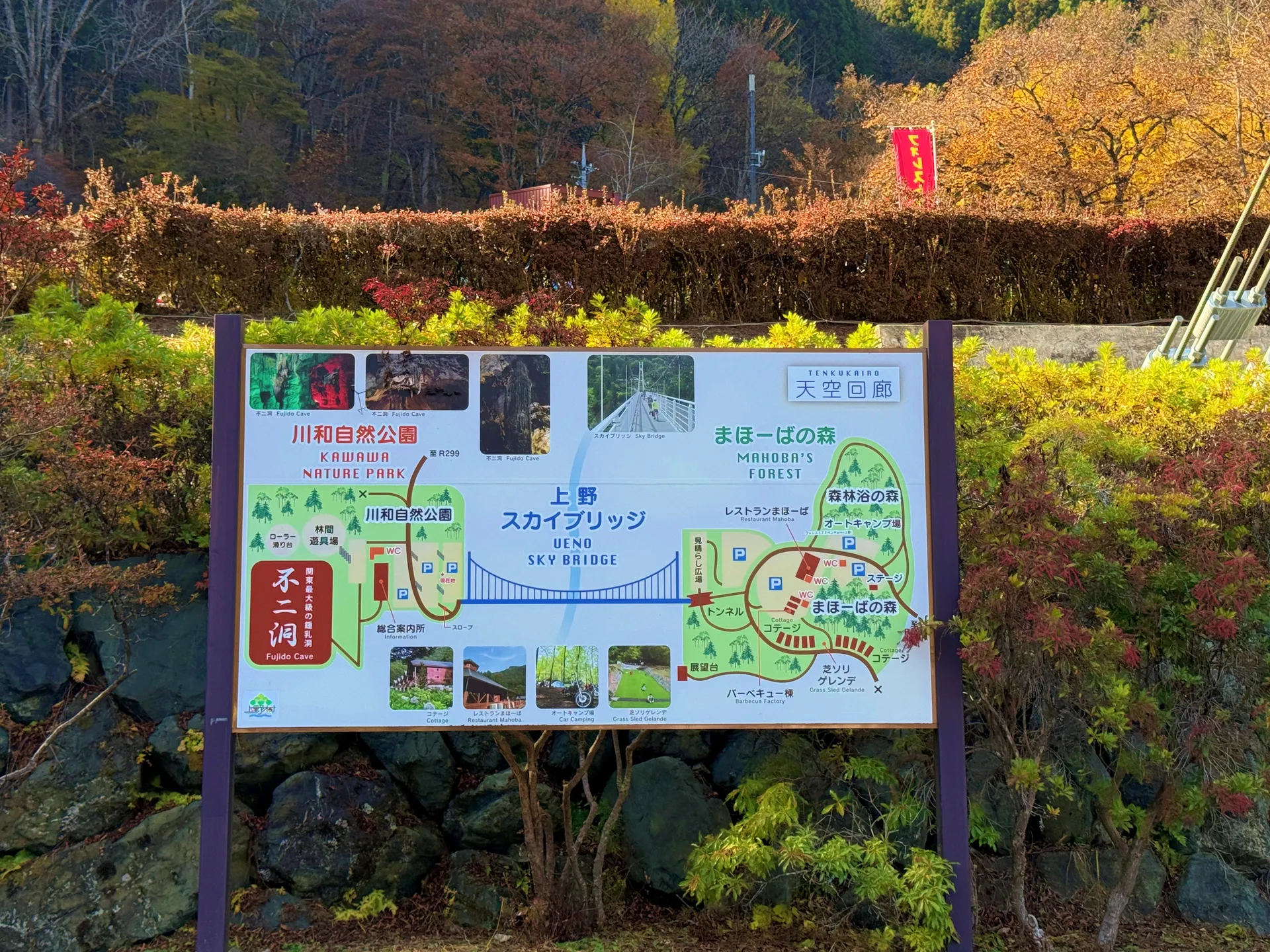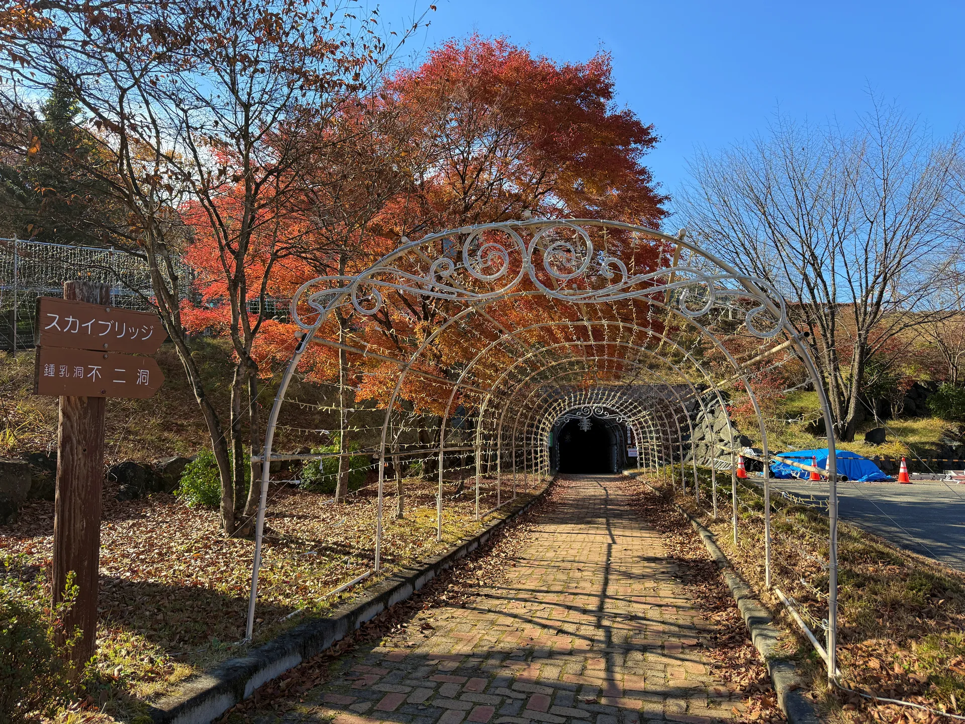 甘味を堪能してから、いざ「上野スカイブリッジ」へ。天空回廊の入っている建物から少し歩くと橋へとつながるトンネルがありました。地上からの高さは90㍍。長さ225㍍の歩行者専用のつり橋です。往復通行料100円。30分ごとに10分ほどシャボン玉が舞う幻想的な景色を楽しめるのですが、これ橋の中央部付近だけと規模が小さすぎて微妙な感じかも💦 関東最大級の鍾乳洞らしい 不二洞は自分の足の状態が悪かったので残念ながら断念。