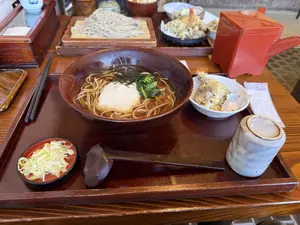 開店25分前ぐらいに福寿庵の前に移動しました。天ぷらセットの無料提供の先着20名の枠は、開店時間には15人いたのでほぼ開店と同時じゃないと難しいですね。開店から10分ほどで先着20名の枠は終わってしまっていました。自分は「山かけそば(温)」900円を注文。無料でいただけた天ぷらセットはかなり美味しかったです。