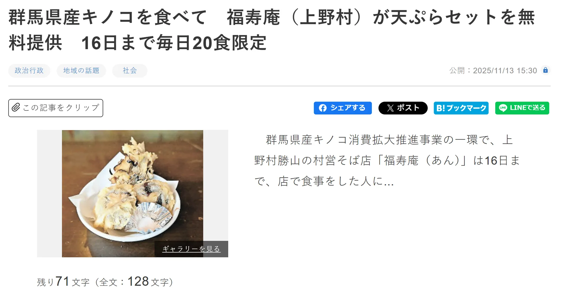 何気なく見ていたニュース記事で見かけたのが以下の天ぷらセットの無料提供でした。場所的に無理じゃないかと思っていたわけです。