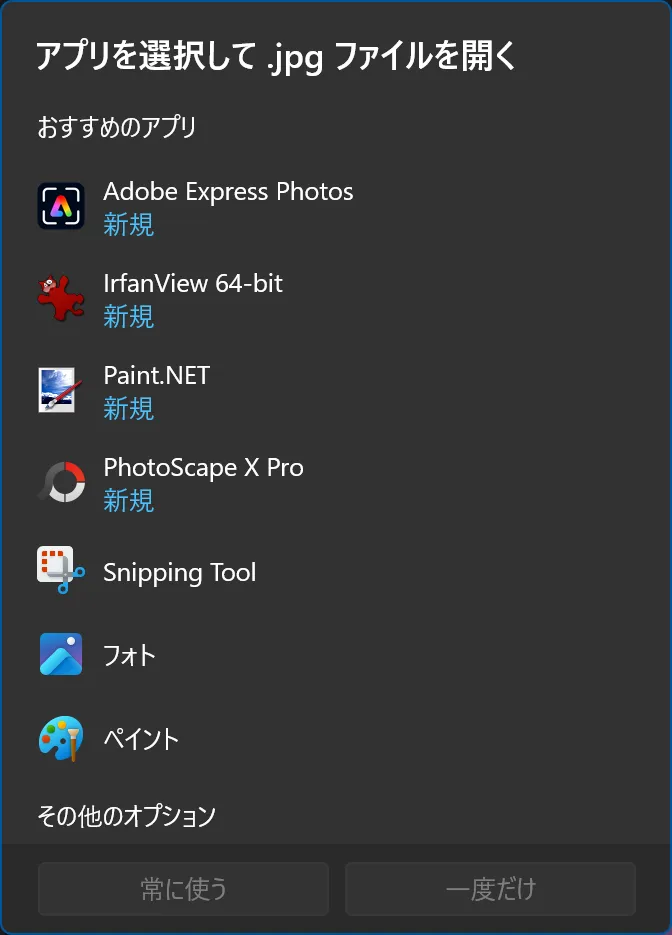 関連付けはうまくいかないことがあるので、その時は最初に画像を開いたときに表示されるデフォルトアプリの選択画面で「常に使う」で設定すれば大丈夫。Windows 11の設定アプリで、「アプリ 既定のアプリ」からファイルの拡張子を入力して個別に設定することも可能です。