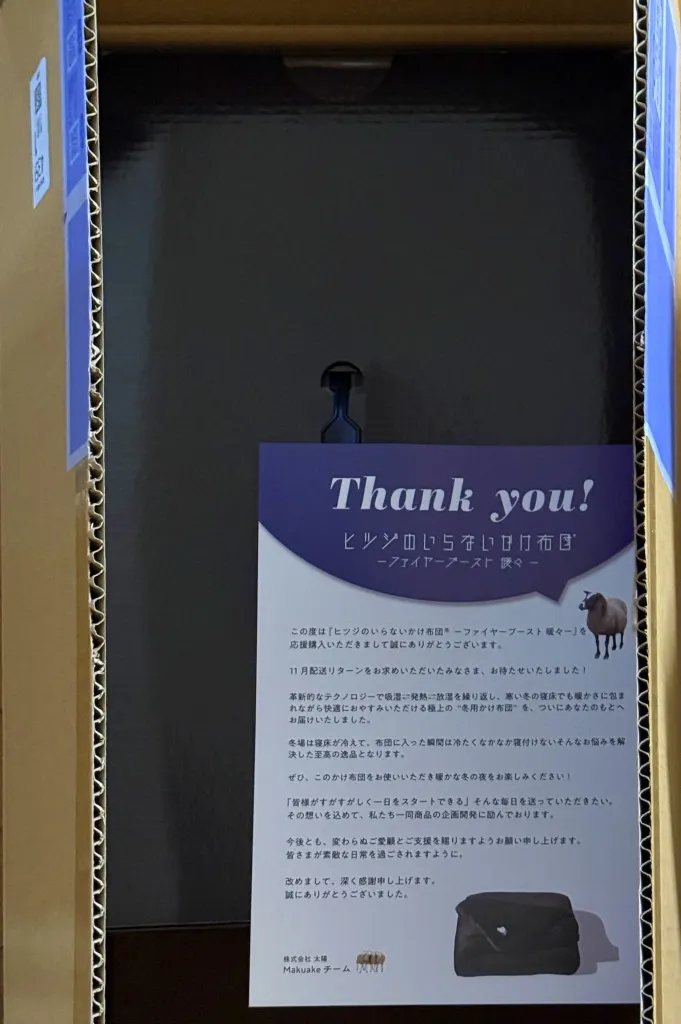 今よさそうな製品は何だろうって調べていきました。そして目に付いたのは「ヒツジのいらないかけ布団®ーファイヤーブースト 暖々ー」です。クラウドファンディング「 Makuake」のプロジェクトに「【2秒で寝落ち?!】たった1枚で冬でも朝スッキリ!贅沢な暖かさに包まれ気持ちいい」ってキャッチコピーで掲載されていたんですよ。「ヒツジのいらない」シリーズは聞いたことがあったので、これでいいかなと判断して購入してみたというわけ。もちろんプロジェクトがSuccessになっている状態での購入です💦
