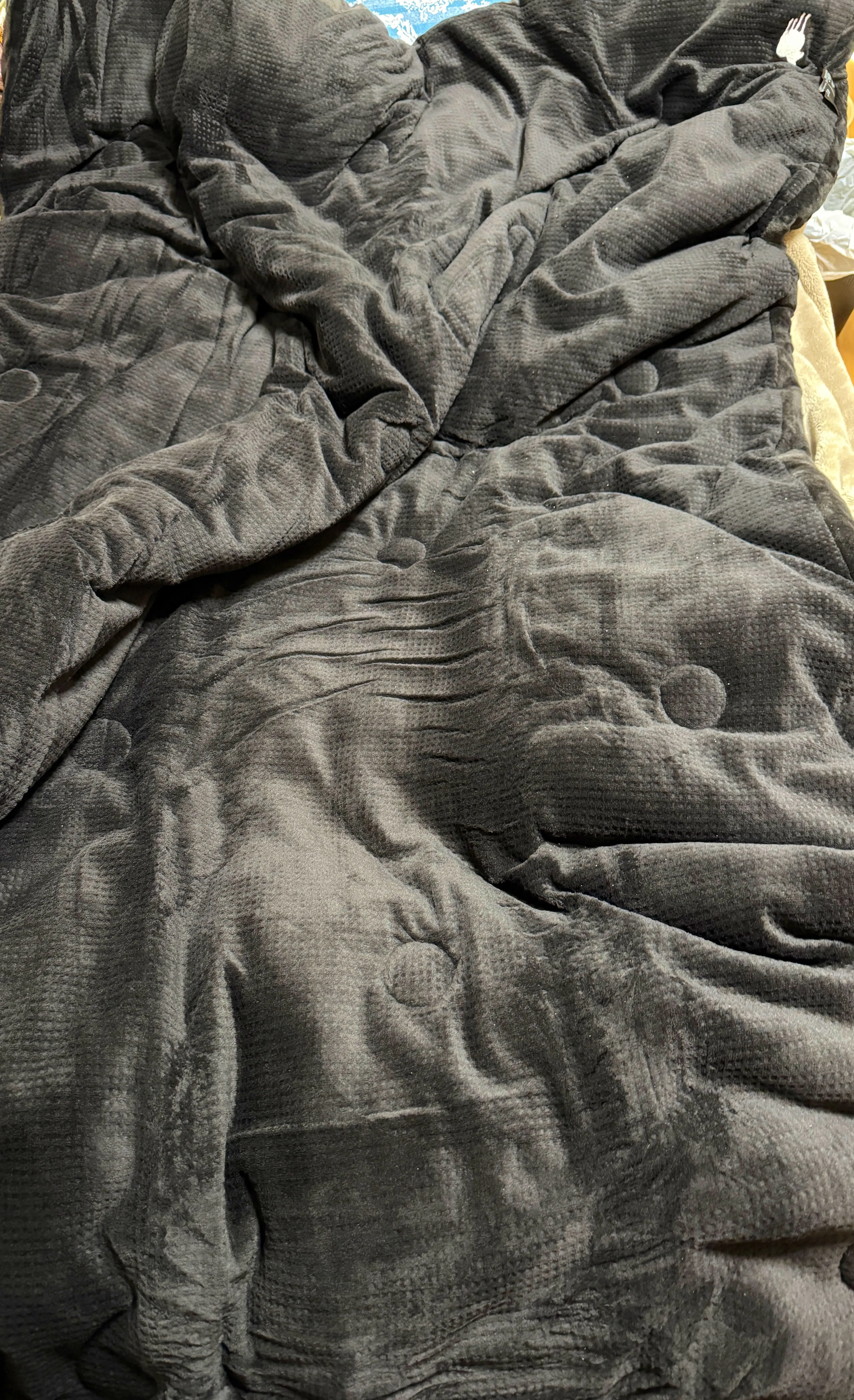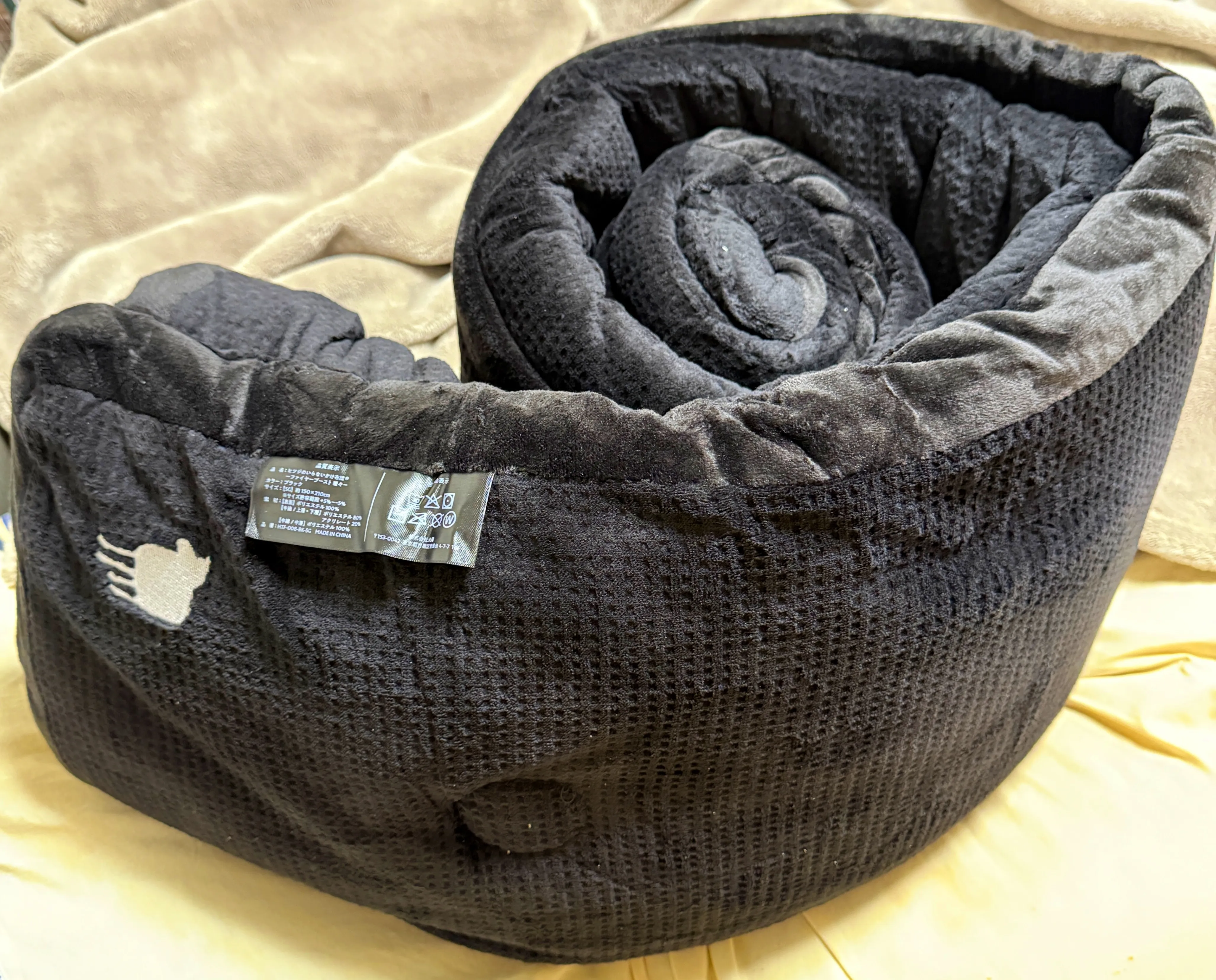 大きさは1人ならばシングルでもじゅうぶん余裕があるものでした。重さは正確に計測はしていませんが、これまで使っていた羽毛布団よりやや軽めという印象。色が黒いから写真を見ると重そうに感じる人もいるかもしれませんが、普通の布団と考えておいて問題のない重さ。安心してください。