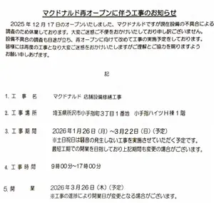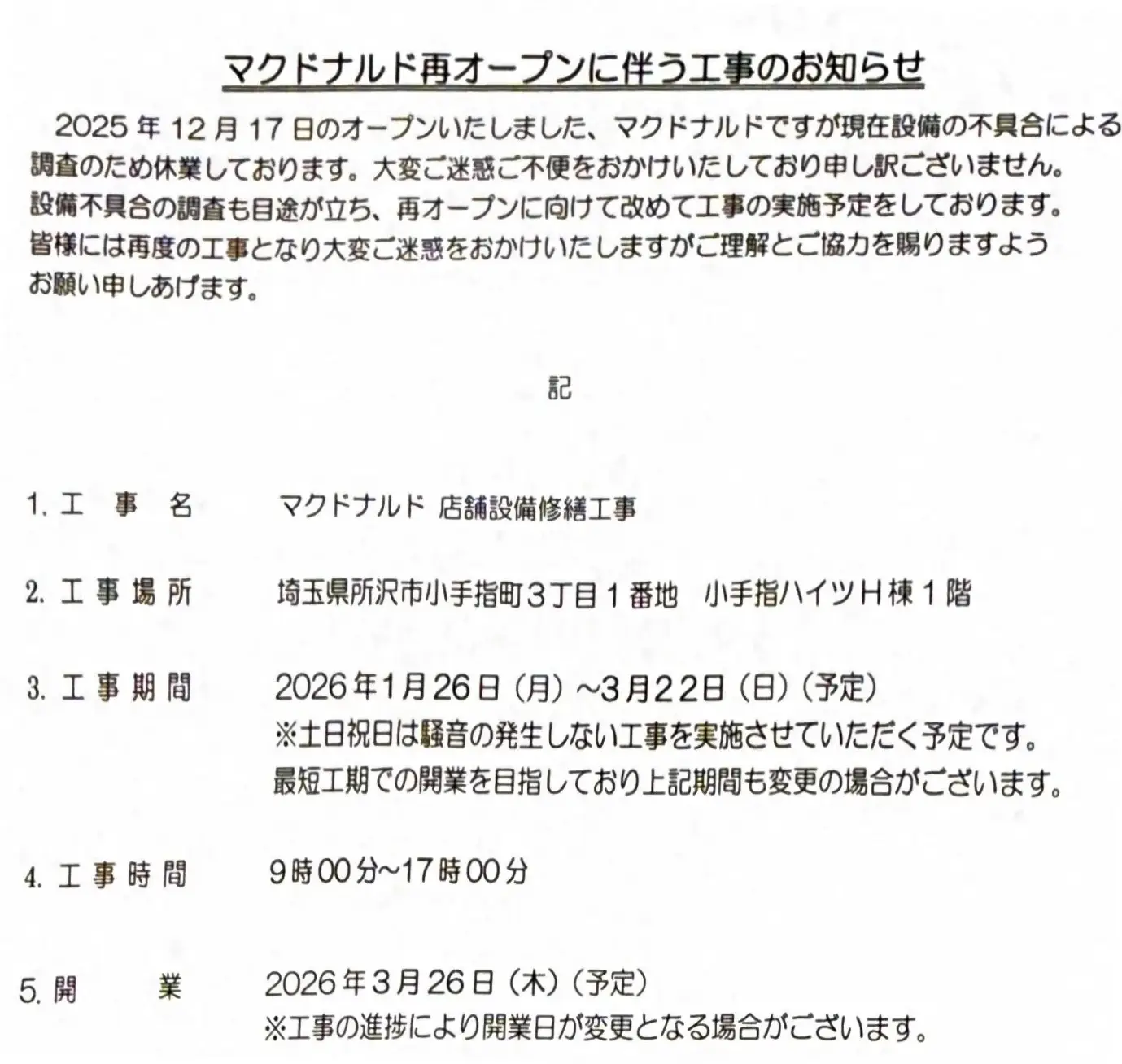 マクドナルド小手指駅南口店の再オープンの時期がわかりましたのでご報告いたします。2026年3月26日予定となっているようです。営業をする上で何らかの問題が起こり、どうも内装を全面的にやり直しをする必要が発生した模様。