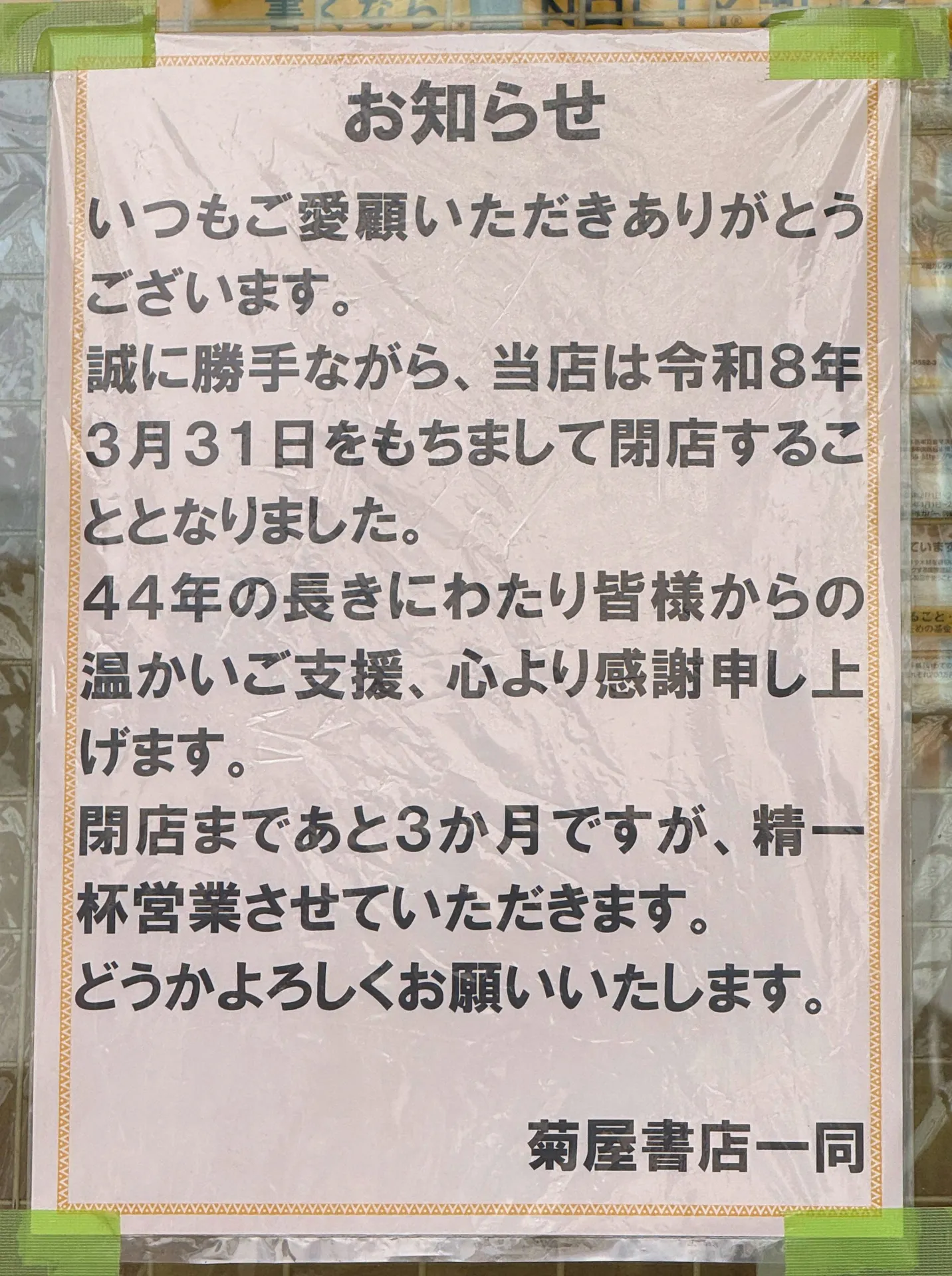 44年という長い歴史に幕を閉じるという非常に重みのあるお知らせですね。本当に書店は減ってきました。昔は出版社で働いていただけに寂しく思ってしまいます。菊屋書店がなくなってしまったら、最寄りの書店はどこになるのだろうか?