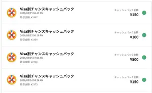今回の「Visa割」で得られたのは以下の通りでした。即日で「Visa割」の抽選ができるわけではないため、まだ一部が未抽選状態であるため、これから抽選が行われる買い物が残っているかもしれない。