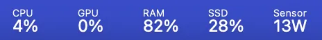 上部のメニューバーにCPU/GPU/RAM/SSD/Sensorの情報を表示できるアプリ「 Stats」。Sensorの精度は電力計付きの電源プラグで計測した結果とは±1Wの誤差があるようです💦
