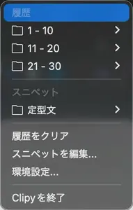 クリップボードの履歴を管理するアプリ「 Clipy」は入れておくべきアプリの最上位かなと思います。Windowsだと+Vで利用できる機能に近いかな。定型文も登録可能なので活用するとかなり楽になります。